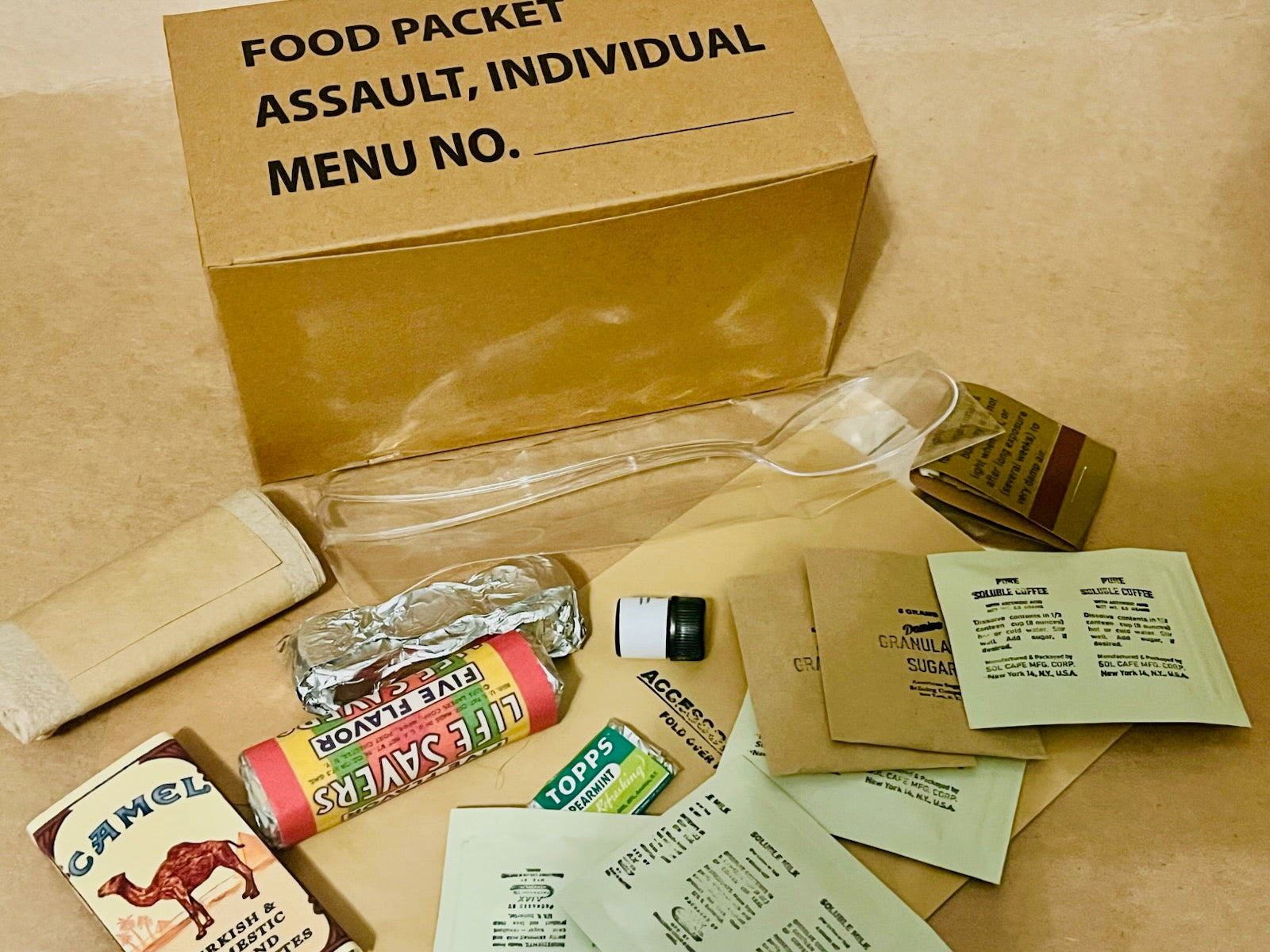 Inside the FPIA carton is two reusable correct sized and stamped cans. The B unit containing an oatmeal cookie and three biscuits made to exact period specifications and the entree unit can. Inside the entree unit can you’ll find freeze dried ready to rehydrate foods - chicken or ham and eggs. Simply add water and enjoy! Also inside you’ll find a pack of three fuel tablets, cellophane wrapped clear spoon and a fully stocked accessory packet. The accessory packet also contains meticulously reproduced contents - two coffee, two soluble milk, two sugar, toilet paper, gum, smokes (no tobacco included), water purification tablet bottle, confection (lifesavers or conserve chocolate bar) - all with historically reproduced packaging! The accessory packet, coffee and milk packets are refillable and reusable.