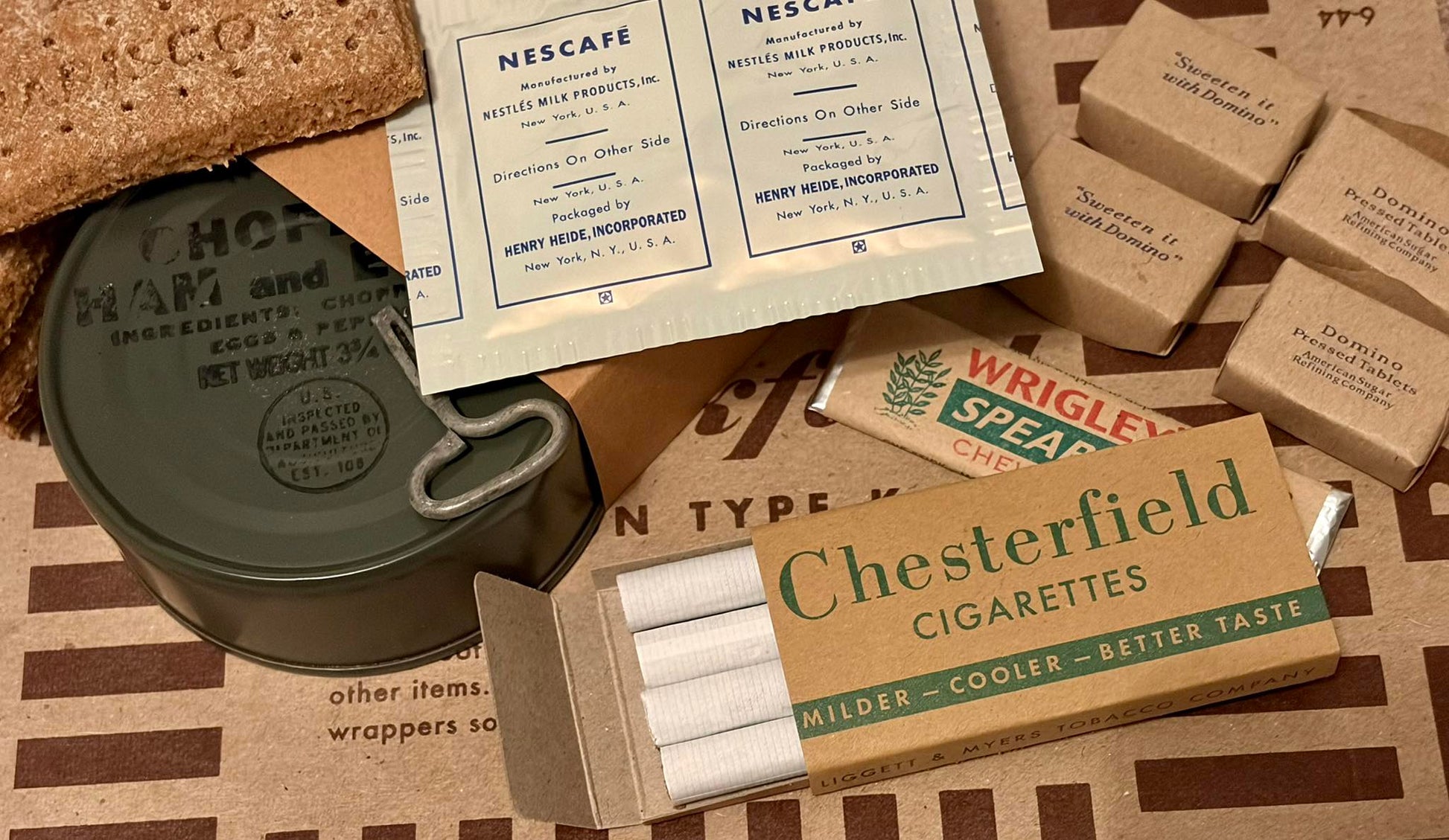 Late war Breakfast: Comes with four Domino or Jack Frost wrapped sugar cubes, two packs of biscuits, late war gum, empty cigarette pack, late war style cellophane wrapped dromedary fruit bar, soluble coffee in correct foil laminated envelope and OD entrée can with wooden paddle spoon. Entrée tin contains freeze dried chopped ham and eggs.